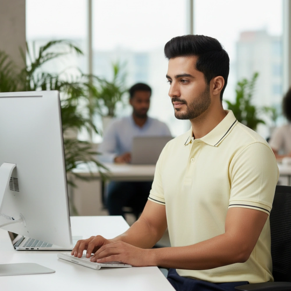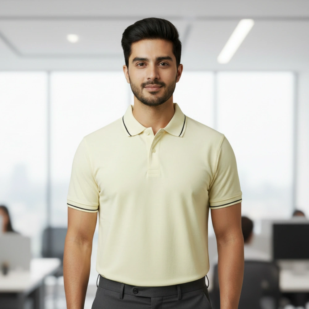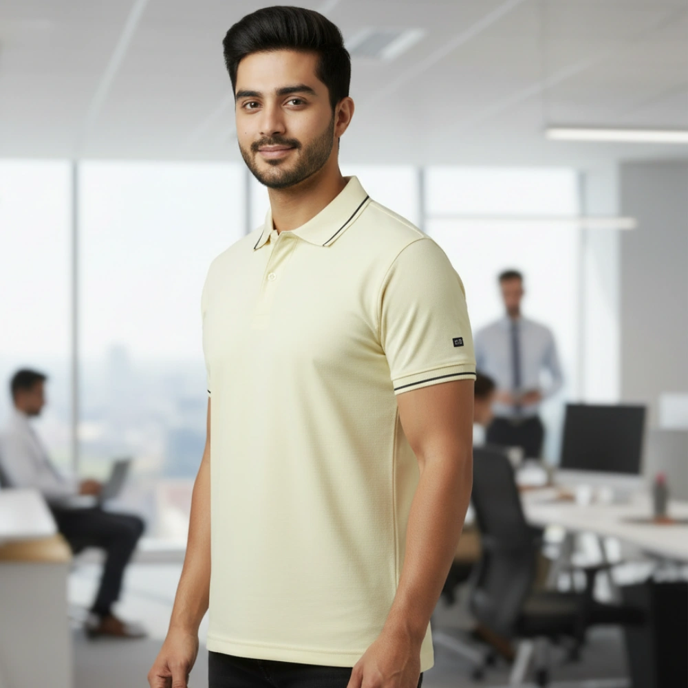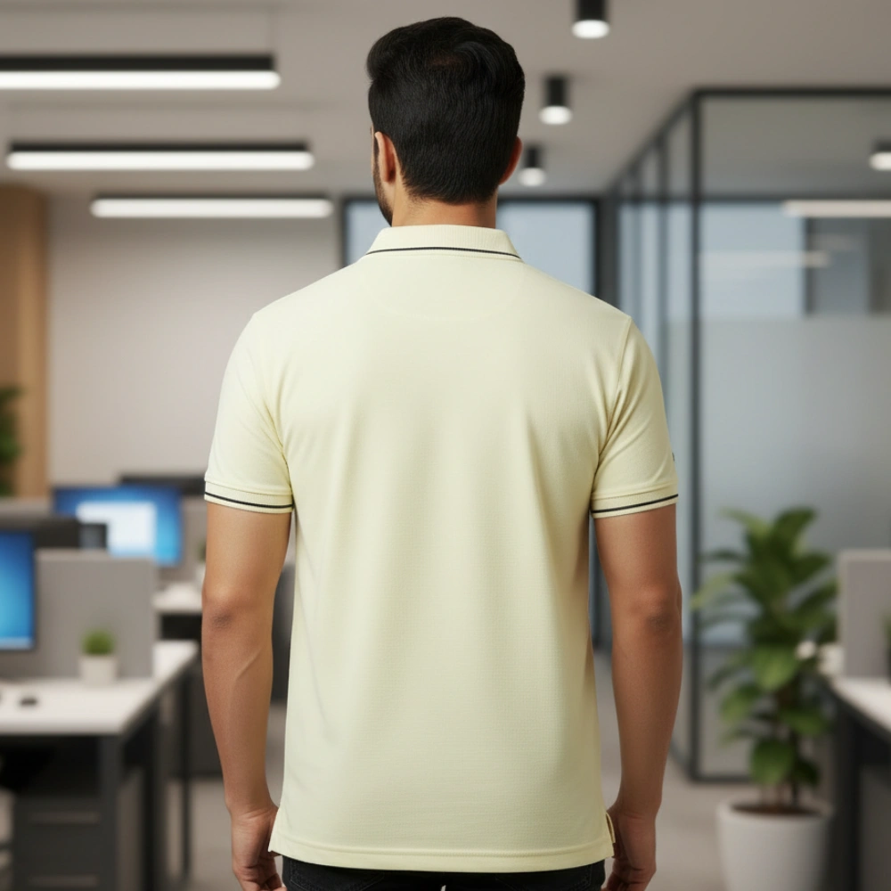 - Color & Design: Features a plain solid body accented by a stylish contrast tip on the polo neck collar and sleeves .
